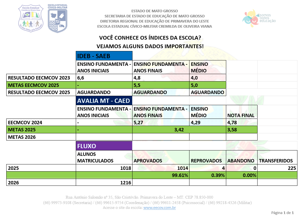 A gestão da EECMCOV informa a toda comunidade escolar os resultados das avaliações externas e fluxo escolar.