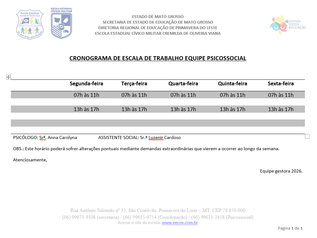 Segue os horários de atendimento da equipe psicossocial na EECOV em 2025. Sendo os horários após às 17h, nas segundas e quartas-feiras, destinados prioritariamente ao atendimento dos pais/responsáveis dos estudantes matriculados.
